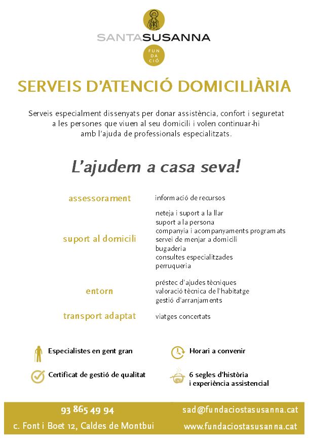 Els Serveis d’Atenció Domiciliària de la Fundació Santa Susanna compten amb un certificat de gestió de qualitat i ofereix serveis especialment dissenyats per donar assistència, seguretat i confort a les persones que viuen al seu domicili i volen continuar-hi amb l’ajuda de professionals especialitzats: