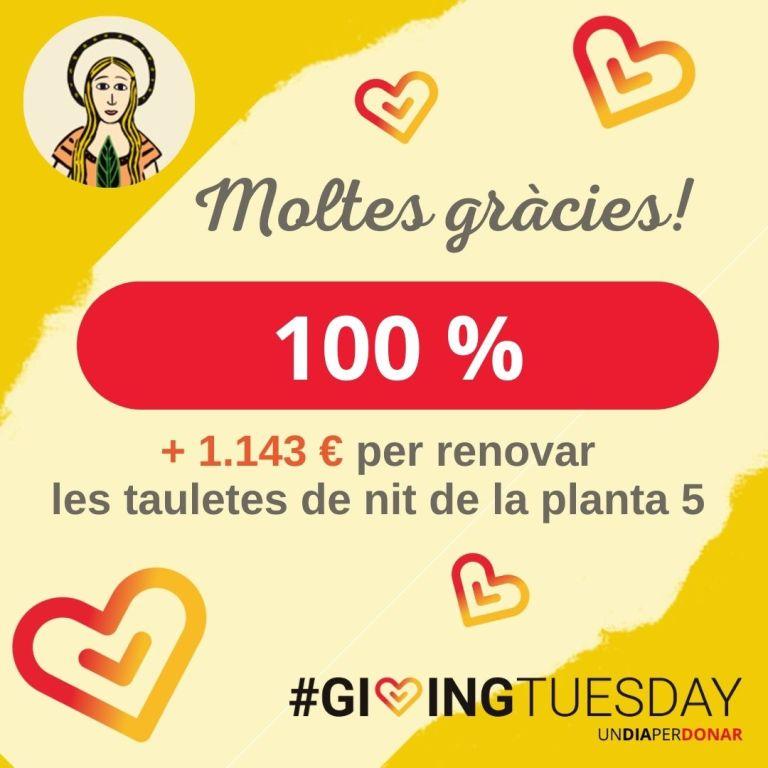 Amb la campanya del Giving Tuesday s’han obtingut 1.143 €.  A aquesta xifra cal sumar els 1.592 € dels donatius de les activitats benèfiques del 2024, aconseguint un total de 2.735 € que superen els 2.665 € necessaris per a la renovació de les 13 tauletes de nit de la planta 5.