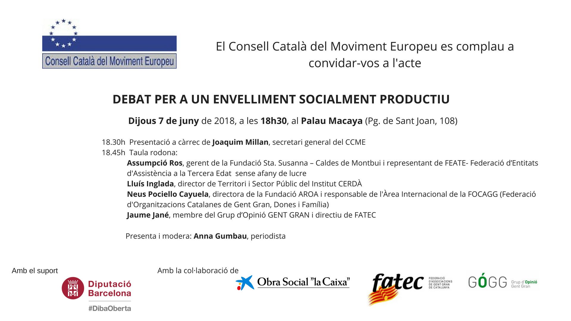 La Fundació ha estat present al debat dedicada a l’evelliment socialment productiu, un acte organitzat pel Consell Català del Moviment Europeu, FATEC i el Grup d’Opinió GENT GRAN, el passat 7 de juny al Palau Macaya de Barcelona.
