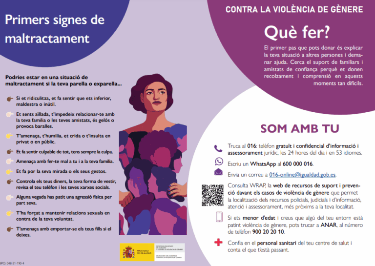 Pòster visual dels primers signes de maltractament i del servei telefònic estatal 016 (informació i assessorament jurídic en matèria de violència de gènere).