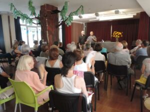 Un introducció a l’etimologia va convidar a reflexionar sobre el significat de les paraules d’algunes professions: el metge té cura (presta atenció, no resta indiferent) i a vegades cura; el filòsof pensa; el mestre ensenya (i les paraules curen i fan de casa) i l’infermer és el que s’ocupa dels que no té fermesa i en la mesura del possible ajuda a restablir la verticalitat.